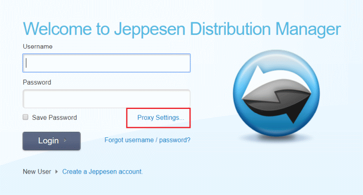 Once the proxy settings have been entered correctly, the user will be taken back to the JDM login screen.  The user must enter their Jeppesen username and password to view services and perform operations in the JDM application.