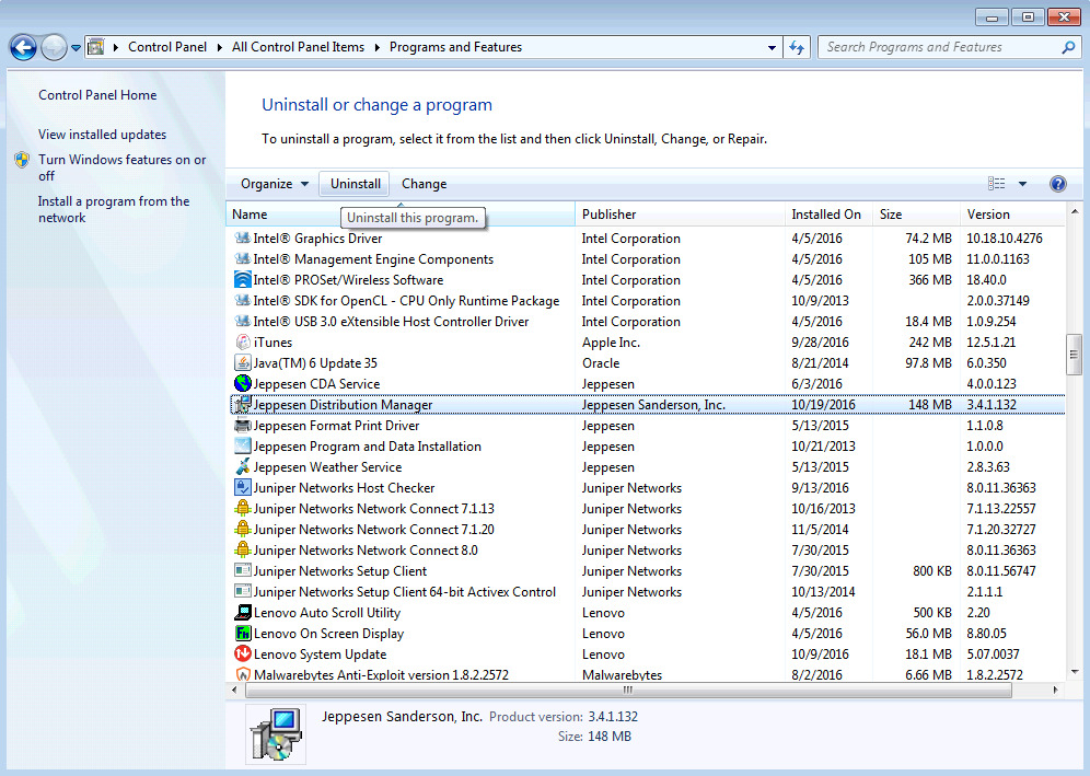 Highlight the Jeppesen Distribution Manager software, and click Uninstall from the list of options.